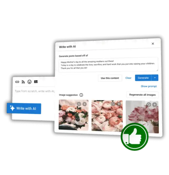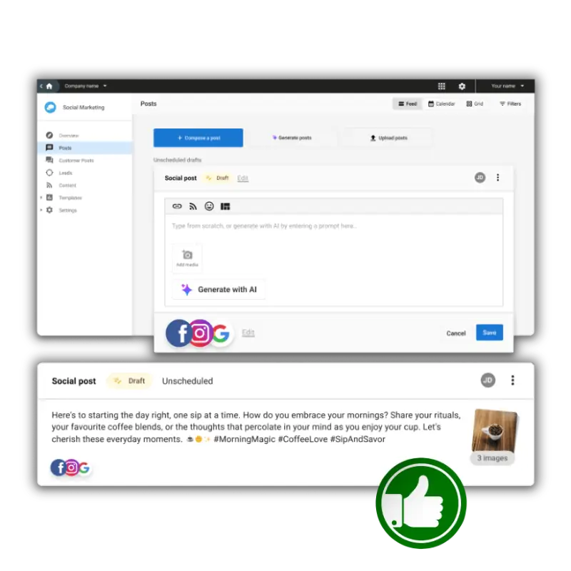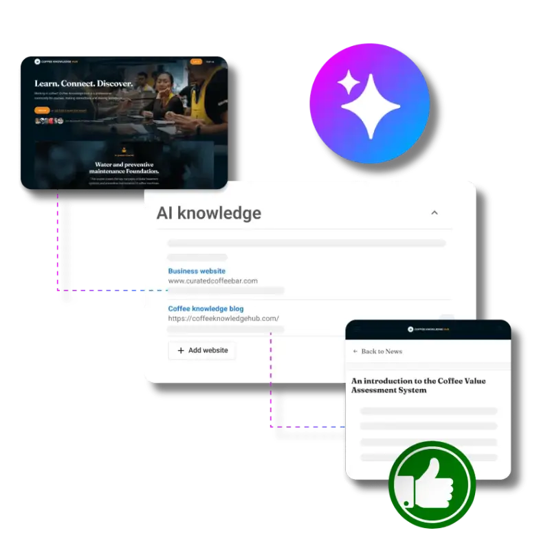 ✅ Train AI on business profiles & websites to effortlessly generate accurate, on-brand social content.